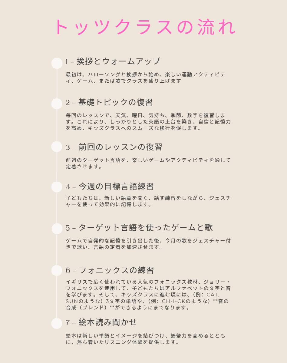 体を動かす遊び、歌、ゲームを通じて、子どもたちは新しい語彙を効果的に覚えます。そして、ネイティブの講師が、この幼少期に非常に重要な発音を指導します。